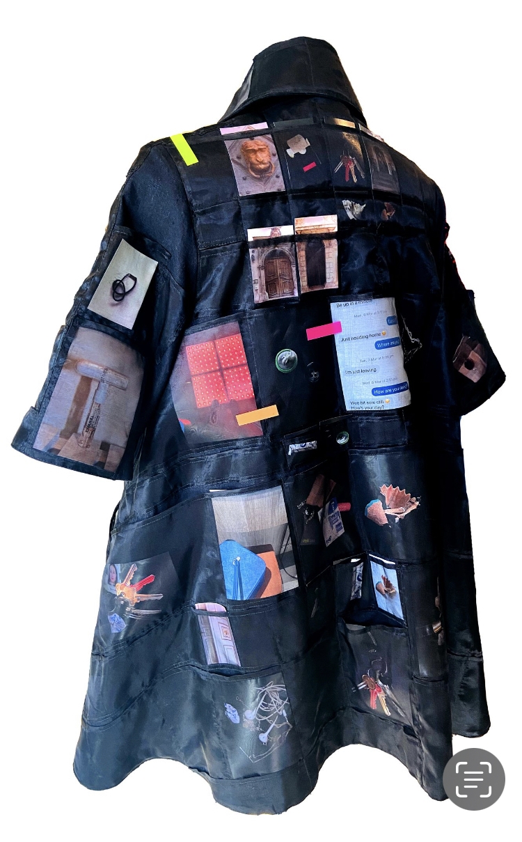 An experimental dress designed to be infinitely changeable for the wearer. A-line so that can be worn by many body shapes and sizes. The black hemp dress is covered with sheer organza silk pockets. Pockets can hold objects or printed pieces of fabric which can be changed every time it is worn.